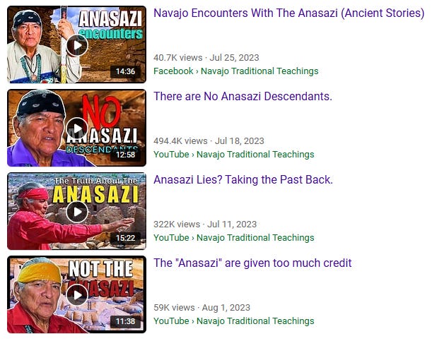 小时候,我在犹他州的核心课程中学习 Puebluan 人的祖先时,他们被称为 Anasazi。此后,这个术语被“Ancestral Pueblan”(祖先 Pueblan 人)所取代,因为 Anasazi 是纳瓦霍语中“古老的敌人”的意思。这种情绪并未完全消退。看看 YouTube 频道 Navajo Teachings,它通常发布人生智慧和教育内容。一个典型的视频是解释纳瓦霍人关于圣者(Holy People)的信仰,这些圣者建立了他们最重要的仪式: