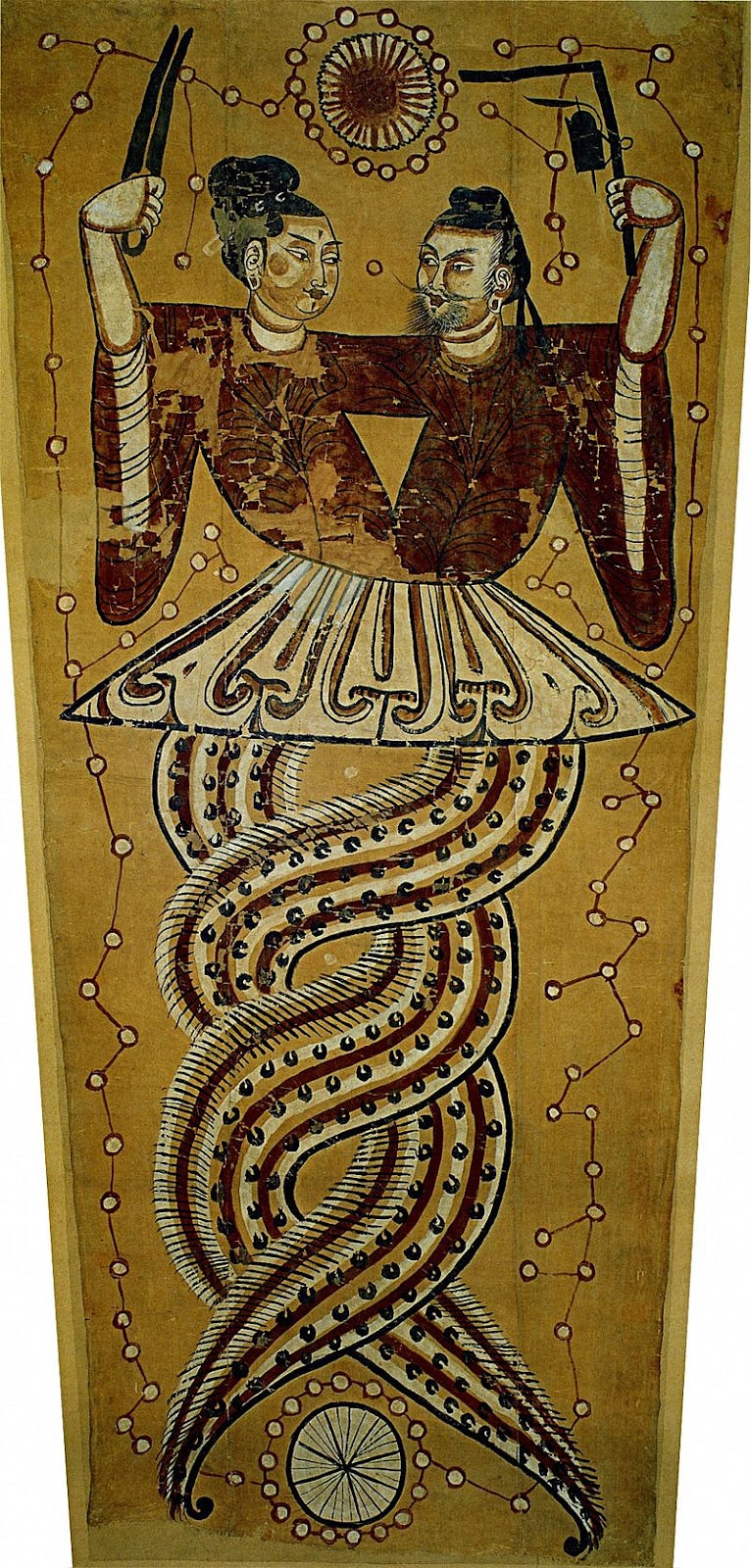 [Image: Visual content from original post]唐代绘画,描绘女娲与伏羲,于新疆出土。男性、女性、创世与蛇再度交织。这一次还额外加入了一些共济会意象: 角尺与圆规。